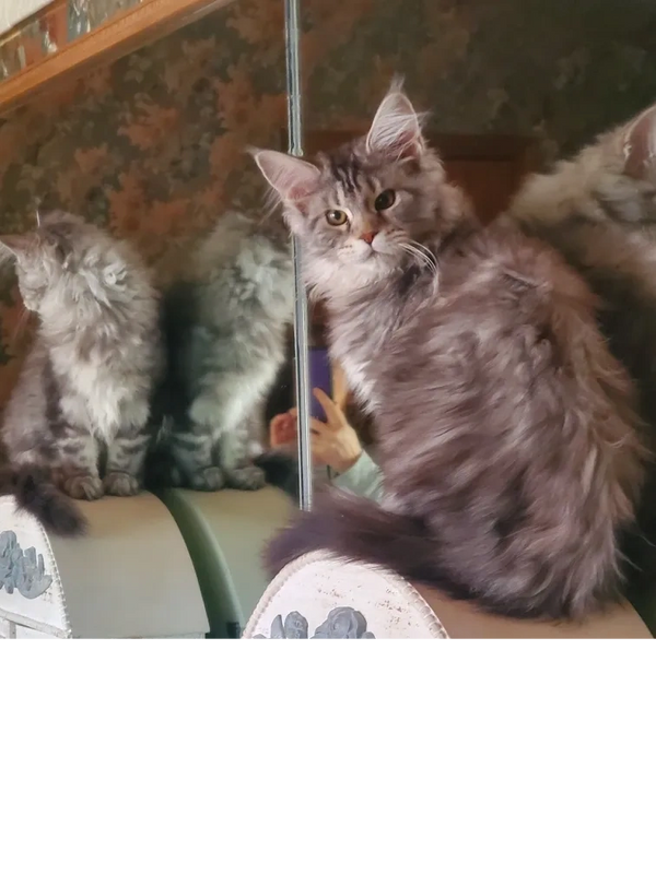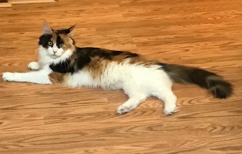 Ellie is a beautiful brown classic van. Van is a white cat with color on the head and tail with up to two patches of color in other areas of the body. The van pattern can be seen in many cat breeds including Maine Coon Cats. Ellie's father is best Maine Coon Cat in CFA and national winner Jaspurrcats Gimme Three Steps More (Stepper) and her mother comes from international winning lines. A huge thanks to Beth Feininger of Jaspurrcats Maine
