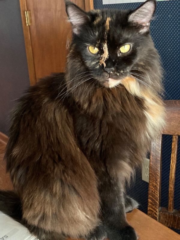 Hot Tamale is a tortoiseshell with beautiful red and cream throughout her luxurious black coat. Tamale is full of personality and loves to play. She is a fantastic mother and has produced a true calico kitten for us. Despite her dramatic beauty, she is a gentle sweetheart and very loving mother.
